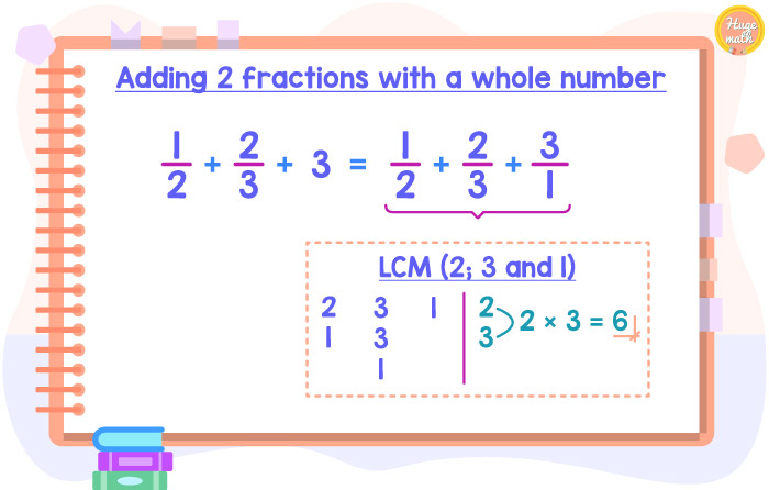 Now we need to add 3 fractions: 1/2 + 2/3 + 3/1. To find the sum, first we find the least common multiple (LCM) of the denominators (2, 3 and 1). The value of the LCM is 6.
