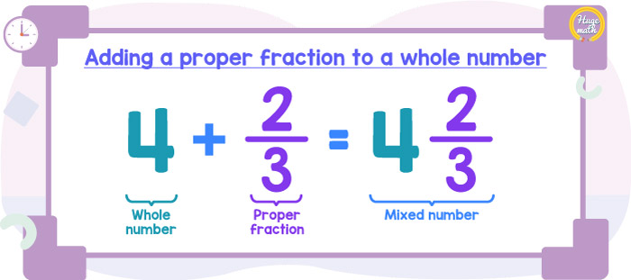 Recall that a proper fraction is a fraction where the numerator is less than the denominator. Also, a mixed number is the sum of a whole number and a proper fraction.