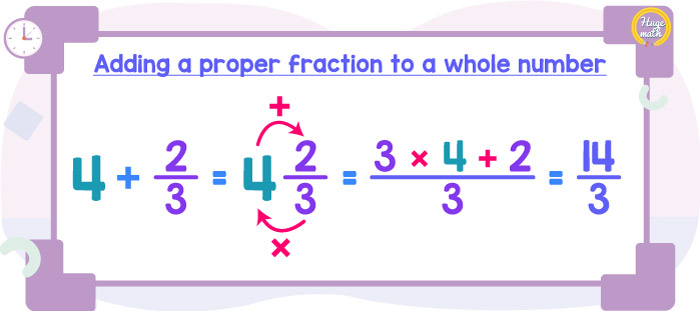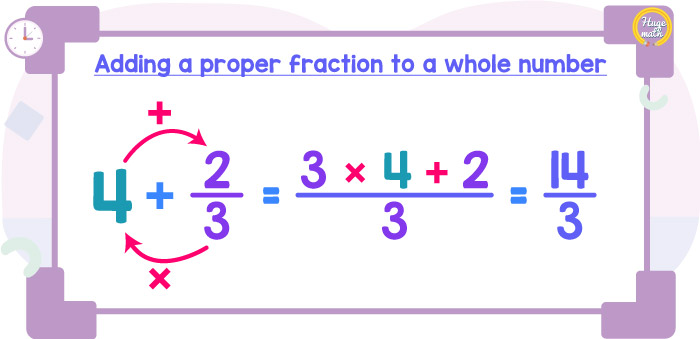 We can use a faster method, it’s possible to directly find the sum of a whole number and a proper fraction without going through a mixed number. First, we multiply the denominator (3) by the whole number (4), then we add this result to the numerator (2). Finally, we write this number over the denominator of the initial fraction (3).